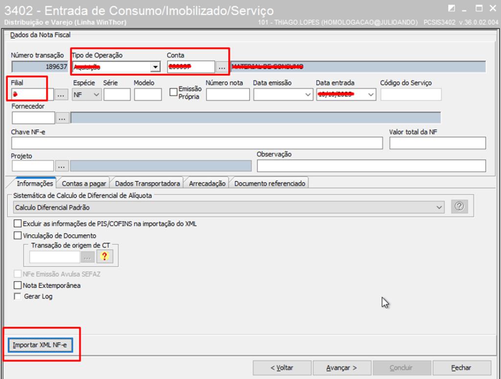 Selecione o Tipo de Operação, informe a Conta de despesa, Filial e clique no botão Importar XML NF-e;