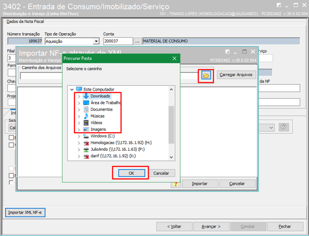 Clique no ícone Pasta, identifique o local onde foi baixado o arquivo xml da nota, clique OK e depois em Carregar Arquivos;