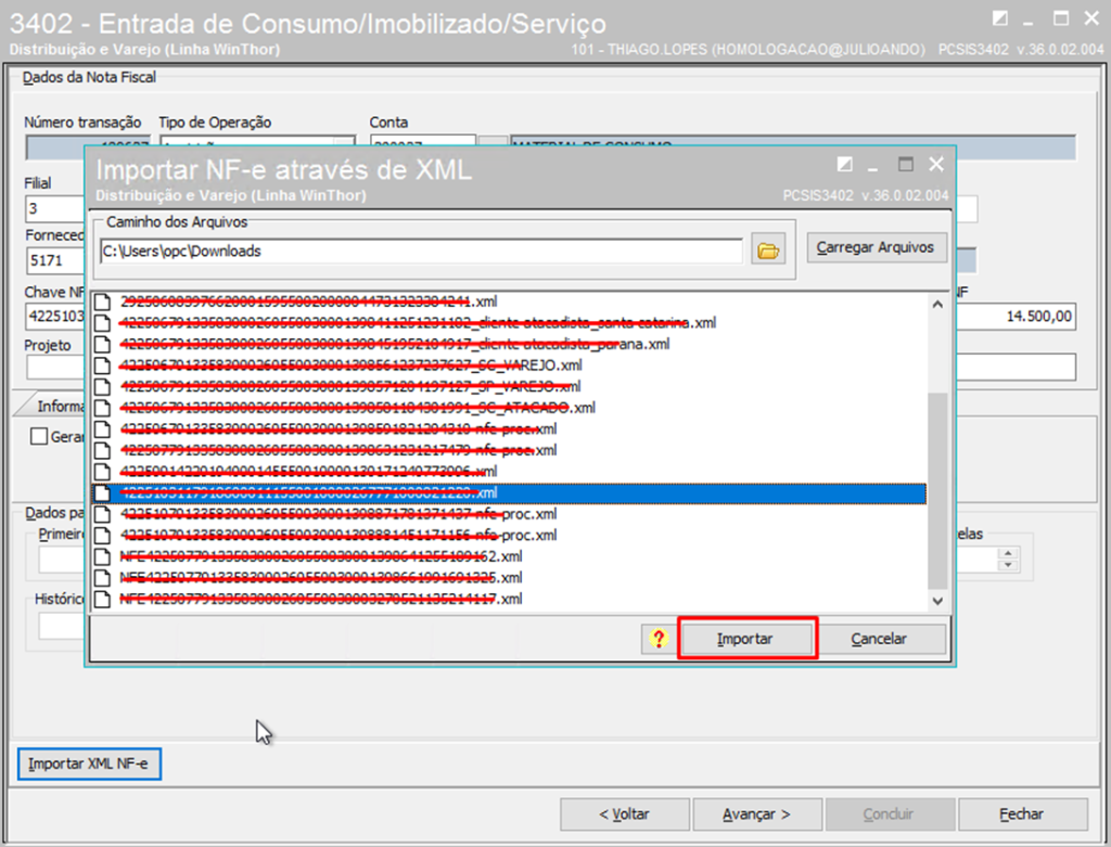 Selecione o arquivo desejado na lista e clique Importar;