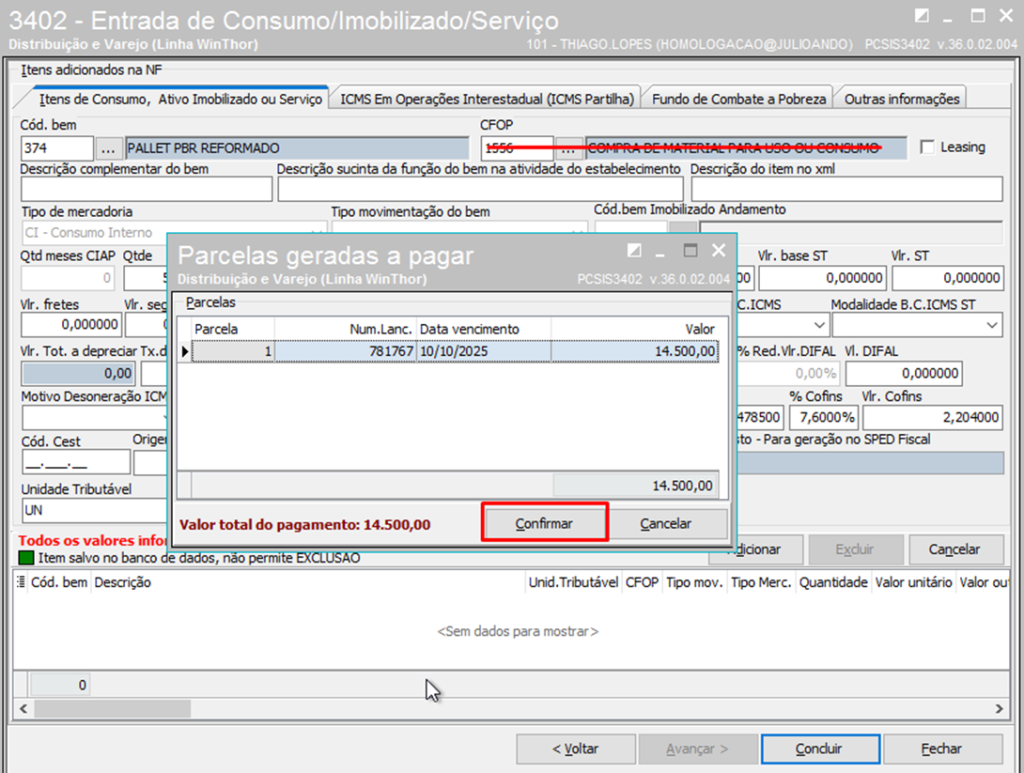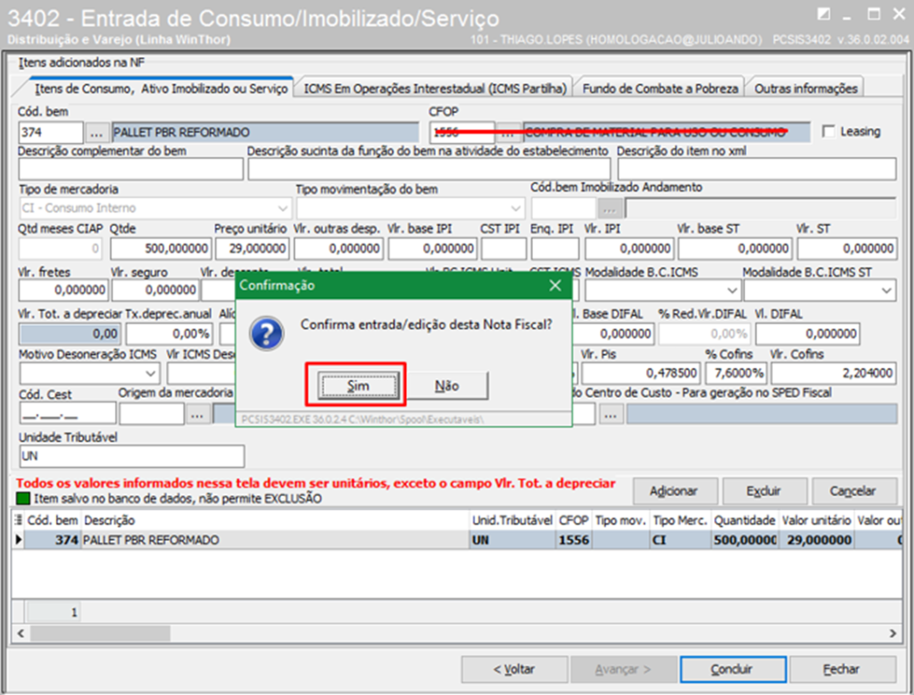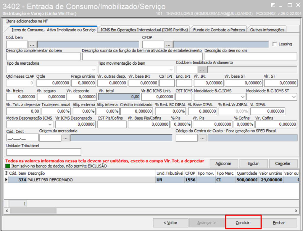 Clique Concluir e confirme a entrada;